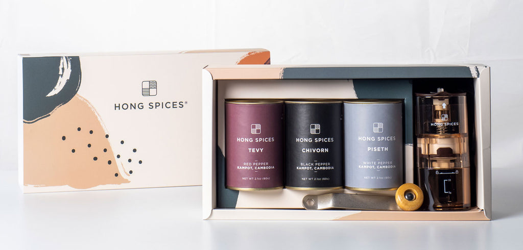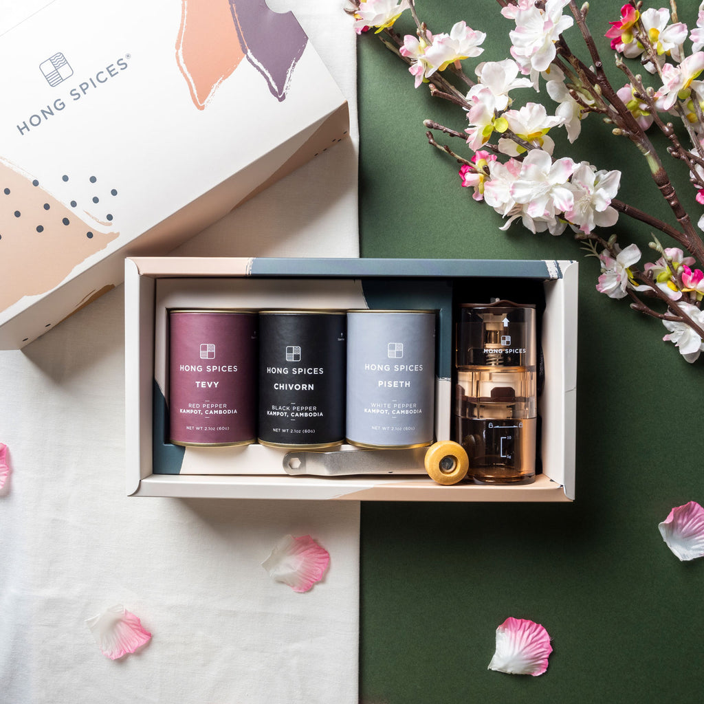 Complete set of our premium whole peppercorns in Black, Red and White with Mini Grinder.